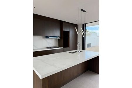 Cocina integral con barra de cuarzo Calacatta y detalles en parota, moderna y funcional.